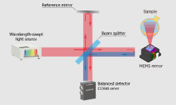 波长扫掠光源对波长进行暂时扫掠,并将其输出光照射到样品上,然后用差分探测器检测所产生的干涉光。通过对获得的波长信息进行傅里叶变换,获得样品深度方向的图像。
