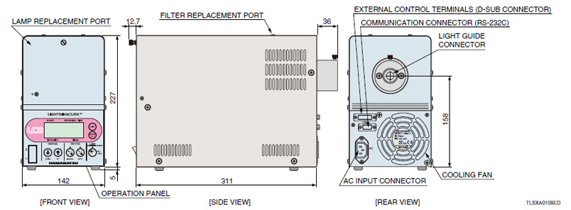 *1:UV 辐射照度(在 365nm 处)是使用滨松 C6080-365 UV 功率计在距离 A10014-35-0110 光导(单独出售)输出端 10 mm 处的一个点的中心位置通过 E5147-04 测量得出的。